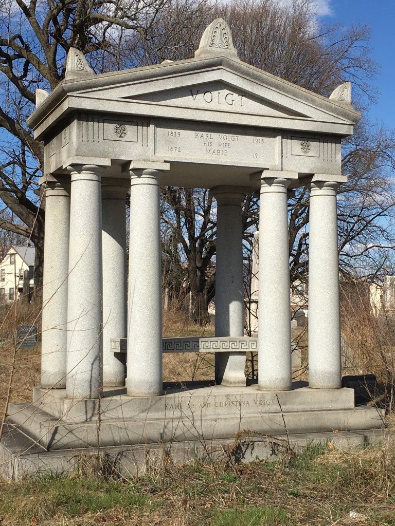 Karl Voigt, whose family has two of Woodland’s more impressive burial monuments right across from each other, was a successful florist and horticulturalist whose flower of choice was roses. He started out his working career as an assistant in his father’s shoe making business. Like many other of Newark’s Germans, the Voigts were from Baden and came to the U.S. after the failed revolution of 1848-49. Research by Guy Sterling