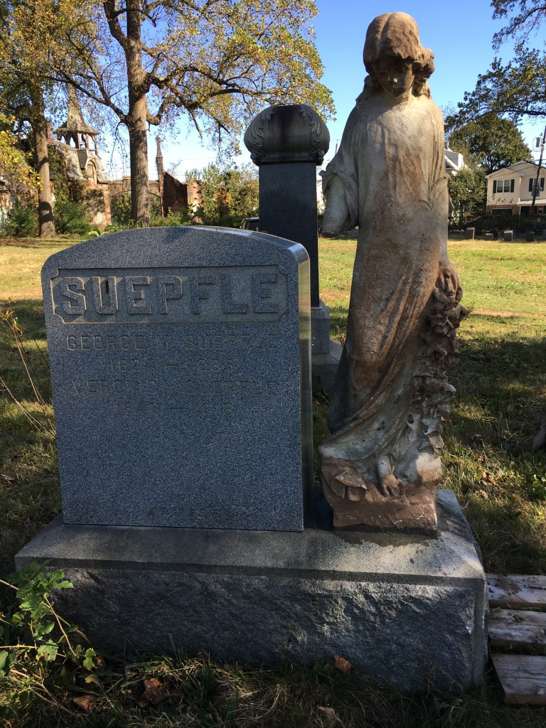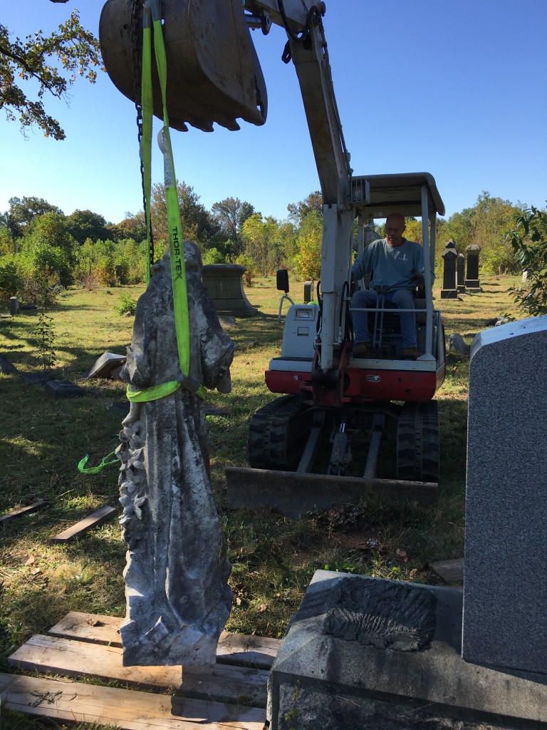 She was found lying face down in the dirt and had been there for an unknown number of years. Then on a day that twenty five (25) heavy monuments were reset, she was returned to her rightful place. Truly a monument of beauty gracing an entrance to Woodland Cemetery.