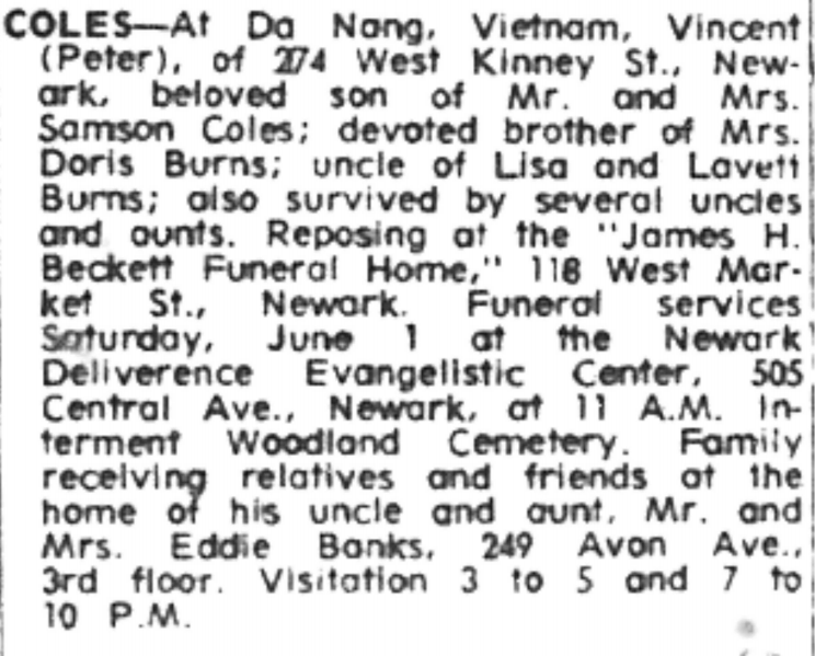 Vincent S. Coles was only 17 when he was sent to Vietnam to fight and had just turned 18 when he was killed in action. A native of Newark, Coles grew up on West Kinney Street and attended West Kinney Junior High School as well as Newark Vocational School. He left school to join the U.S. Marines Corps and began his basic training at Parris Island on March 23, 1967. After his basic training concluded in May, Coles was sent to Camp Pendleton, CA, and Fort Sherman in the Panama Canal Zone for specialized jungle training. He began his tour of duty in Vietnam on Feb. 19, 1968, as a rifleman with the rank of private first class assigned to the 1 st Marine Division, 3 rd Battalion, 27th Marine Regiment, I Company. Coles lost his life in a combat operation in Quang Nam Province in the northern part of South Vietnam just three months after his tour began — on May 16, 1968. It was during what became known as the North Vietnamese “Mini-Tet” offensive. The area was known for heavy fighting because of its proximity to communist North Vietnam. The official account of the circumstances surrounding Coles’ death was that he “died through hostile action, small arms fire.” He was killed during one of the deadliest weeks for American soldiers in the entire Vietnam War and at a time when American and North Vietnamese negotiators were in Paris conducting peace talks. The Newark Evening News reported that, in his last letter home from Vietnam, Coles mentioned that two of his service friends had been seriously wounded and he felt “something is going to happen.” Coles was one of more than 1,500 New Jersey residents and almost 60,000 Americans who died in the Vietnam War. Only 3,000 of that total were 18 years of age or younger. On the day the U.S. Defense Department announced Cole’s death, it also reported that nine other New Jersey servicemen had died in the Vietnam conflict, one of the state’s largest weekly casualty lists of the war. Coles’ photo was on the
