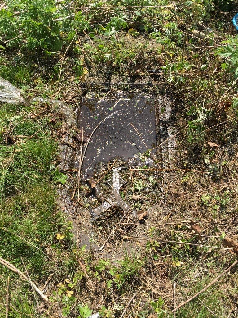 The headstone for Charles F. Schaefer was first found lying face up below the grass line and filled with water. From here the headstone was repositioned onto its side facing South which allowed the water to drain and the Sun to dry it.