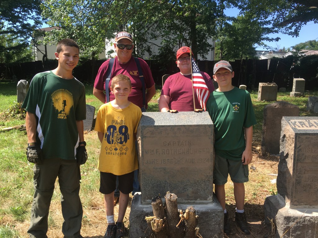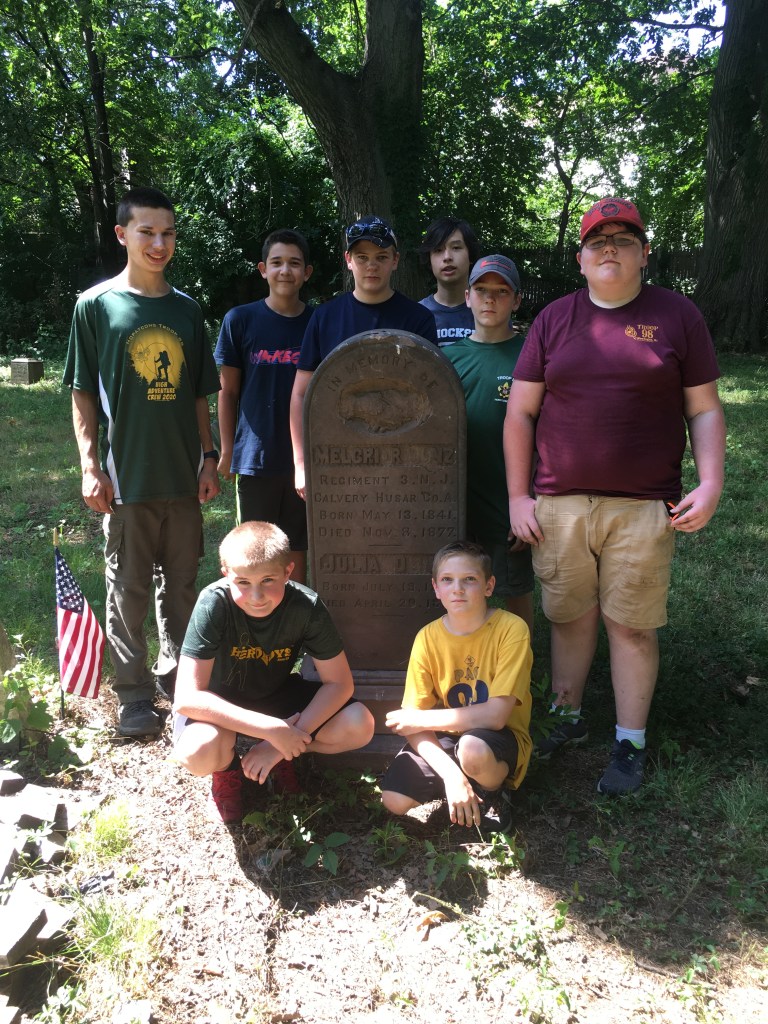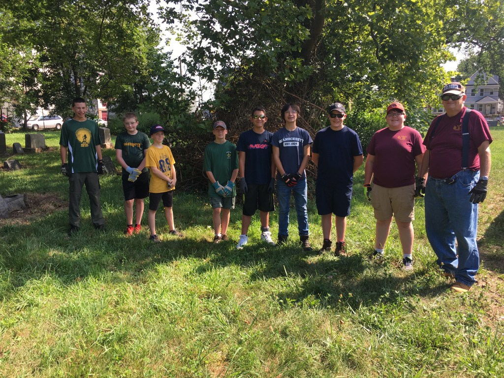 Eight scouts showed up at Woodland Cemetery on 7-29-2020 supervised by Scout Master Patti Poland (not pictured) and Wes Shelton. One cub scout from Pack 88 and six boy scouts from Troop 88, both groups from Hopatcong NJ. The eighth scout is from Troop 98 out of Hopatcong, NJ. Overall, six scouts earn community service hours and two scouts earned credit towards their Environmental (Historic) Preservation Merit Badge. They all worked very hard and helped cleanup the fallen brush in Section 1 and then proceeded to help reset fallen headstones. Great job everyone and you certainly left this area in better condition than how you found it. Go forth and be prepared. Thank you from the Managers of Woodland Cemetery.