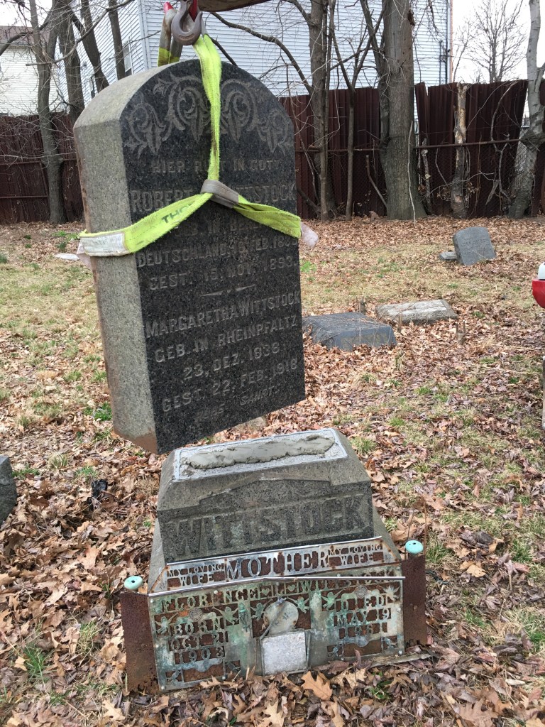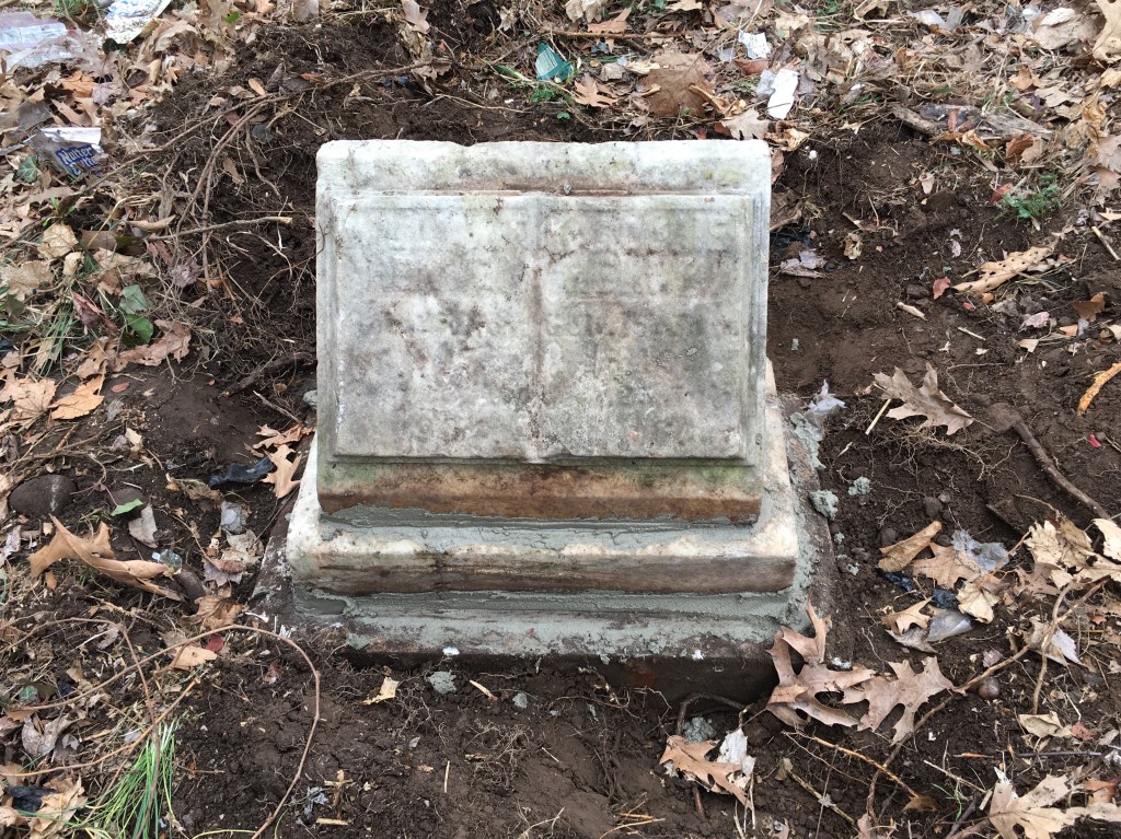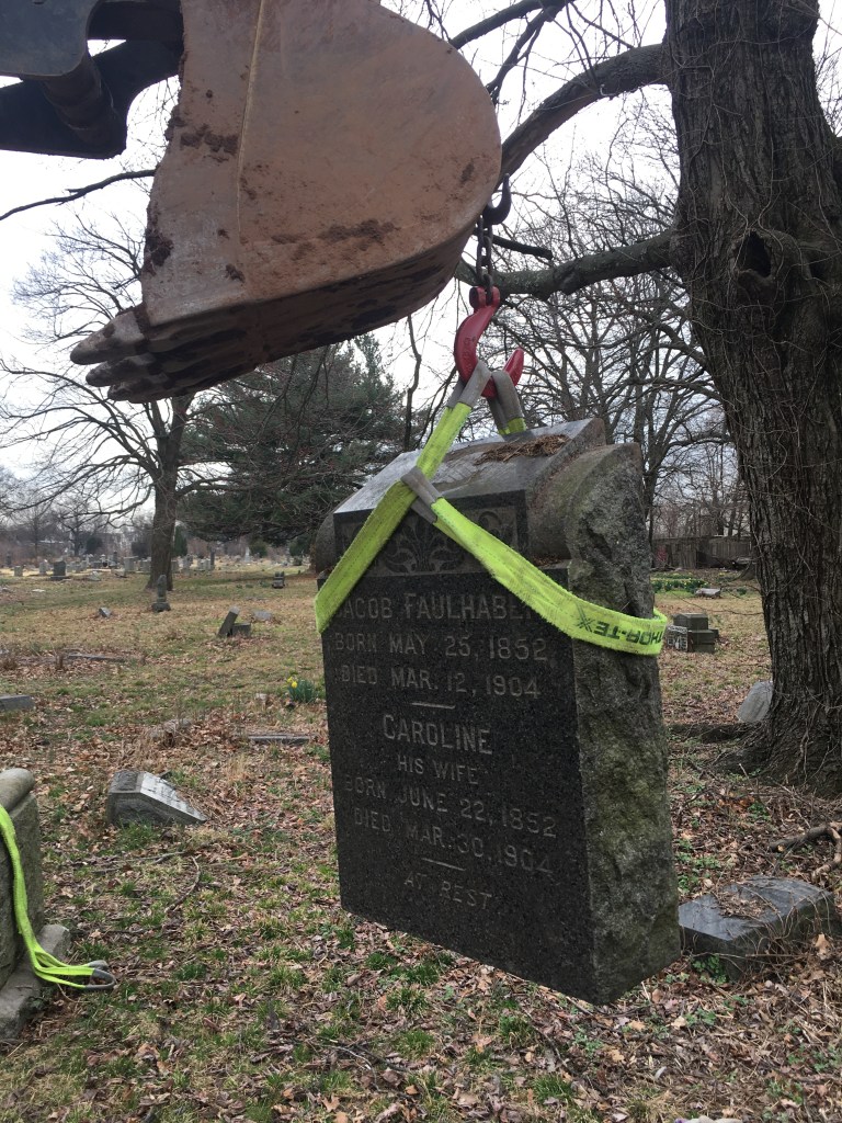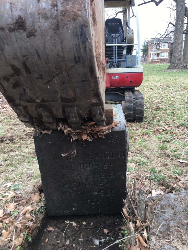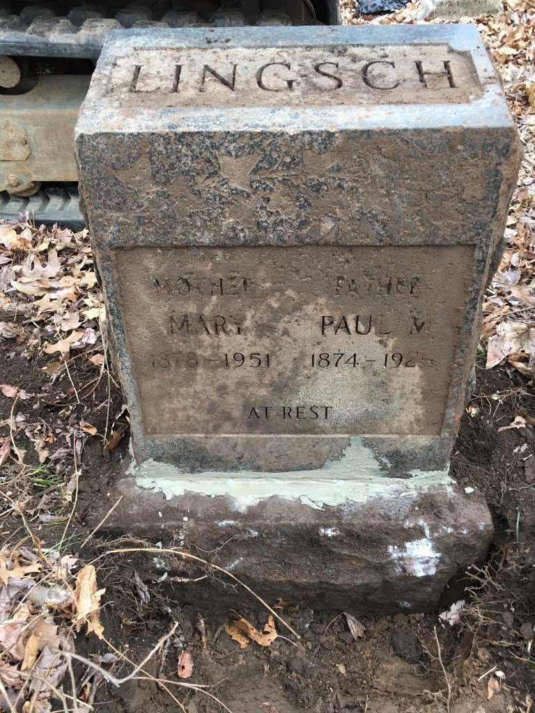 Although this work occurred a few months ago, twenty-six headstones were reset on this long busy day. Some stones were small and easily handled by one person, but some stones were extremely heavy requiring an excavator machine to lift using special straps. Many stones were buried face down for a very long time. This was another productive day cleaning up and restoring the grave at the Northerly end of Section One facing Cypress Ave.