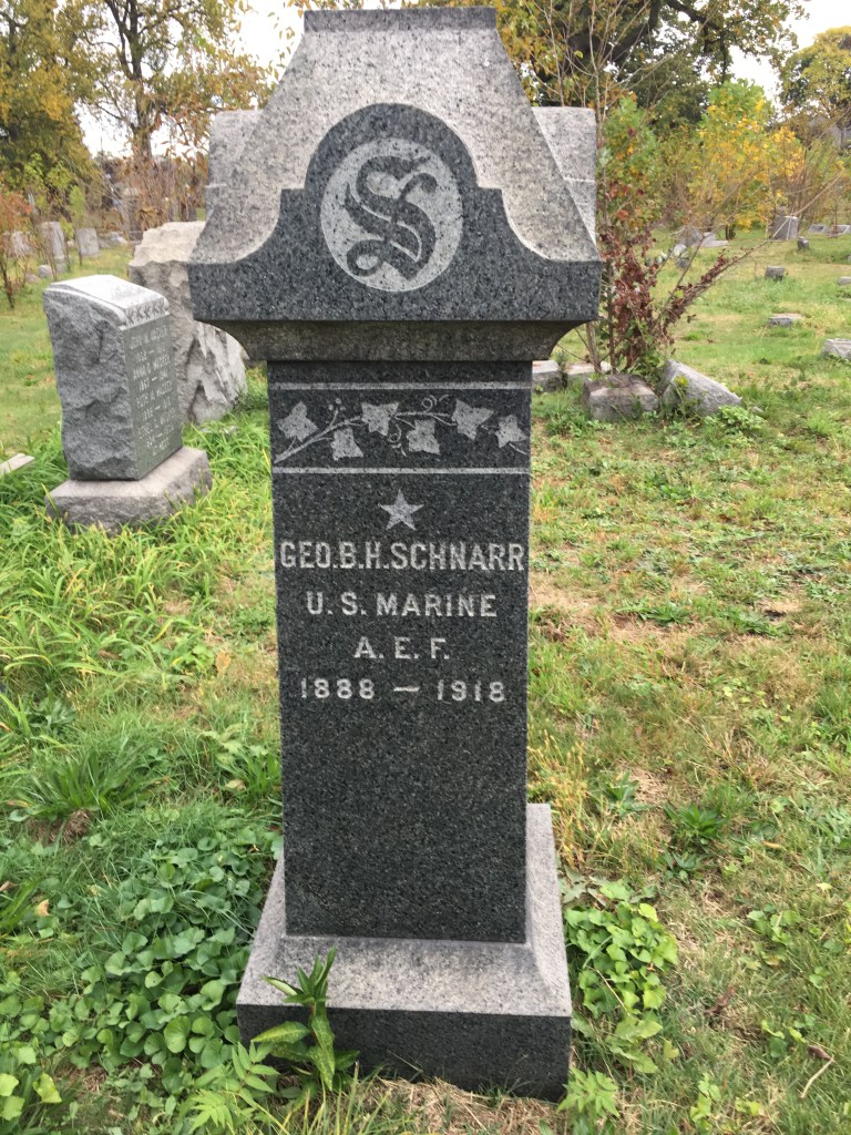 Remembered in Woodland Cemetery with a cenotaph on the Schnarr family plot memorial. Cenotaph