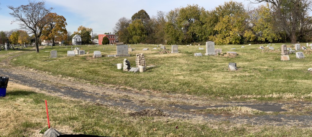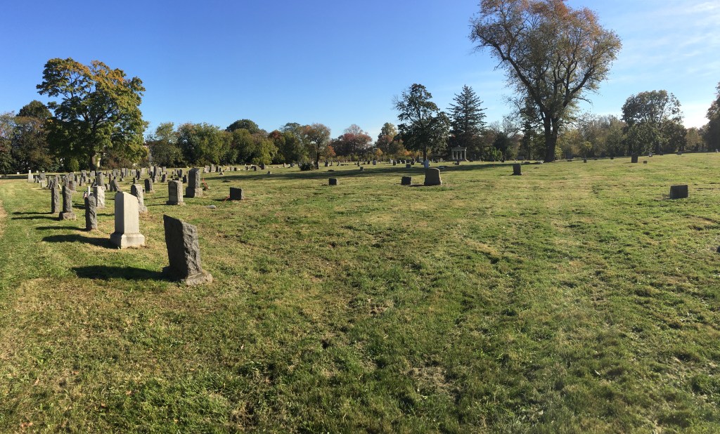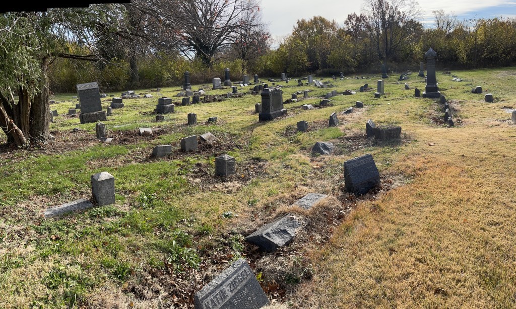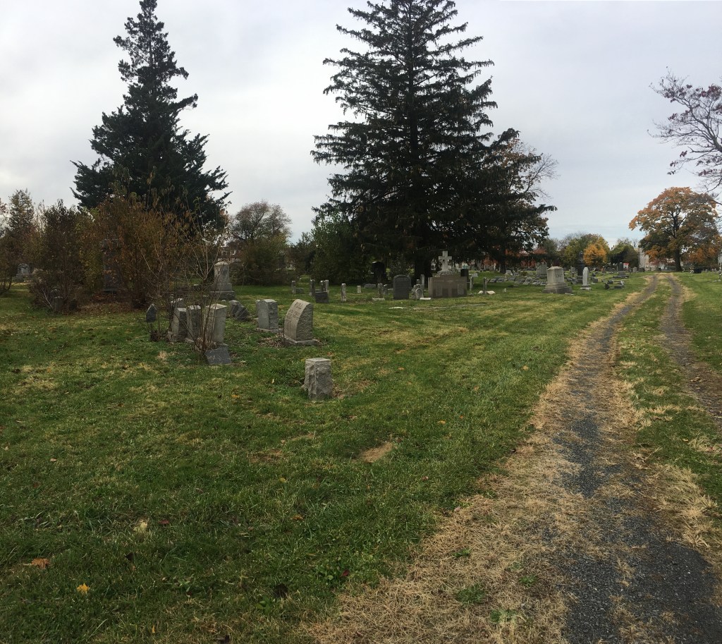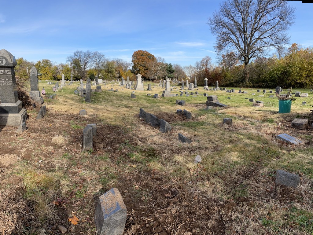 The following photos show our final cut for the season in the maintained area. In sections 1, Q, Y and Blocks 1 & 2 the current work of pulling vegetation, leveling depressions and resetting headstones can be seen in various stages of progress including finished. This restoration process has become repetitious and time consuming, but progress can be seen.