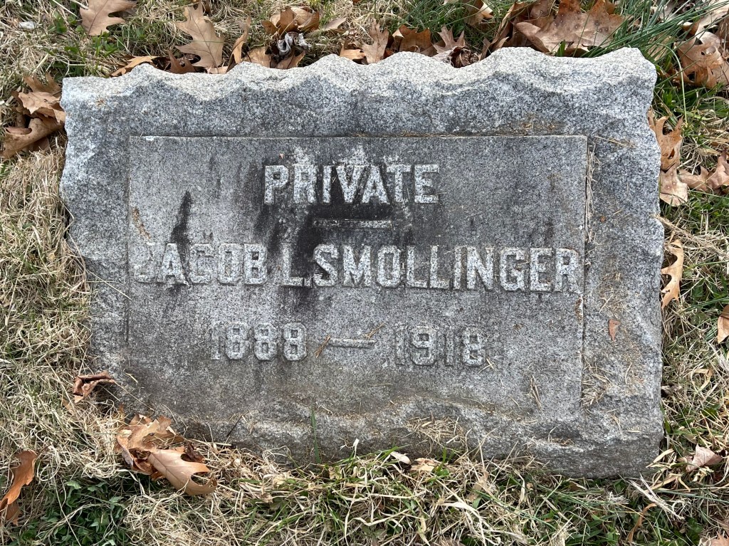 Private Jacob L. Smollinger (aka Schmollinger) is buried in Section Y Lot 294 with his sister Mary (Schmollinger) Besson. Jacob was from Newark and served in WW I. He was shipped over to France in September 1918 as part of Medical Replacement Unit #24. Unfortunately, he became sick and died withing days of arriving in Europe and it is presumed he died of influenza although not confirmed. Since he died before the end of the War and in a hospital, the Army shipped his remains home. His parents Jacob and Christina Schmollinger are buried in Section 69 Row 114 Grave 44. Research by Wesley Shelton.