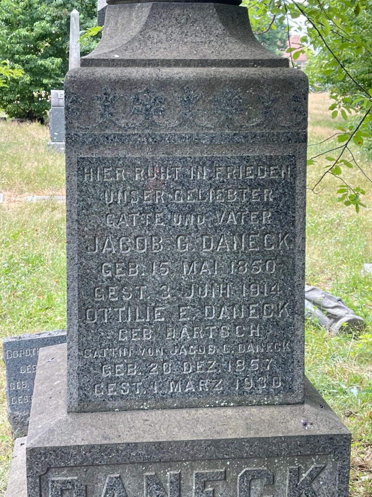Recently Keri Deskins visited the Daneck Plot 99 Section S containing the graves of her GGGparents Jacob George Daneck and Ottillis Daneck. Also, her GGparents Arthur Willnus and Claudine Edna Daneck Willnus and others. She brought her family photo albums containing many old photos.