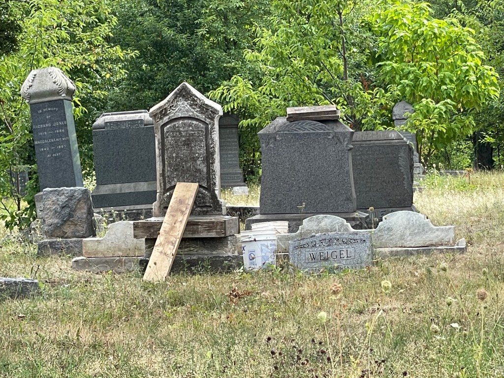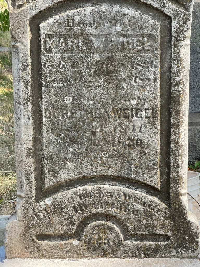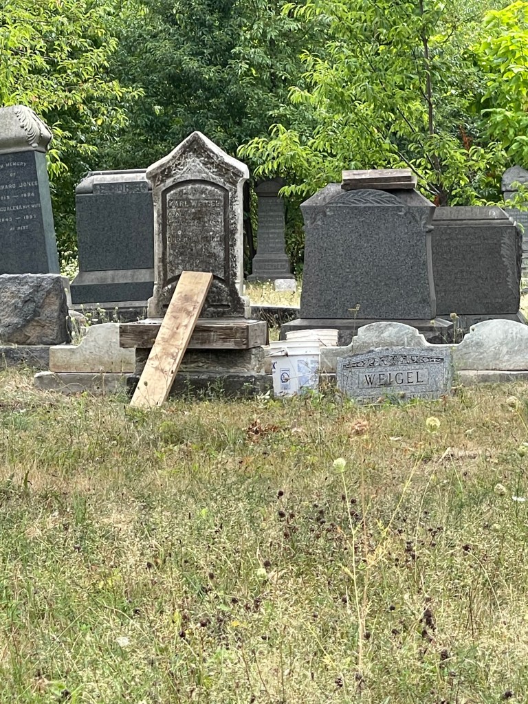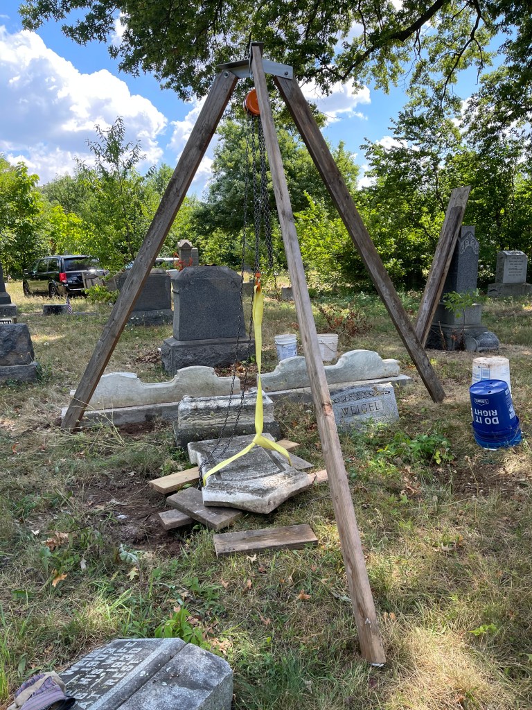 This very heavy headstone was found lying down partial buried for what must have been many years. A tripod was used to hoist the heavy stone up which was first grouted to the original base and then a concrete collar was added to secure the stone in place. This stone is now on full display in its upright position a true early monument standing out in the area. This marker is for Karl Weigel grave 1R and Dorothea Weigel grave 2R located in Section S Plot 55.