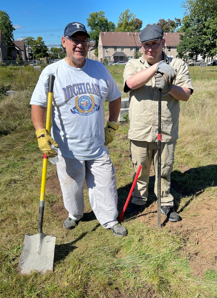 Richard S Jeremias (l) from Michigan visiting the grave of his GGGrandparents Carl David “Charles” Jeremias and Christina Fredericka Jeremias. Also buried in the grave located in Section 11 Row 19 Grave 51 is their one-year-old baby daughter Frederica Margaretha Jeremias. Pictured with Richard is nephew Matt Scheich the family historian as they probe hoping to find a buried Jeremias headstone.