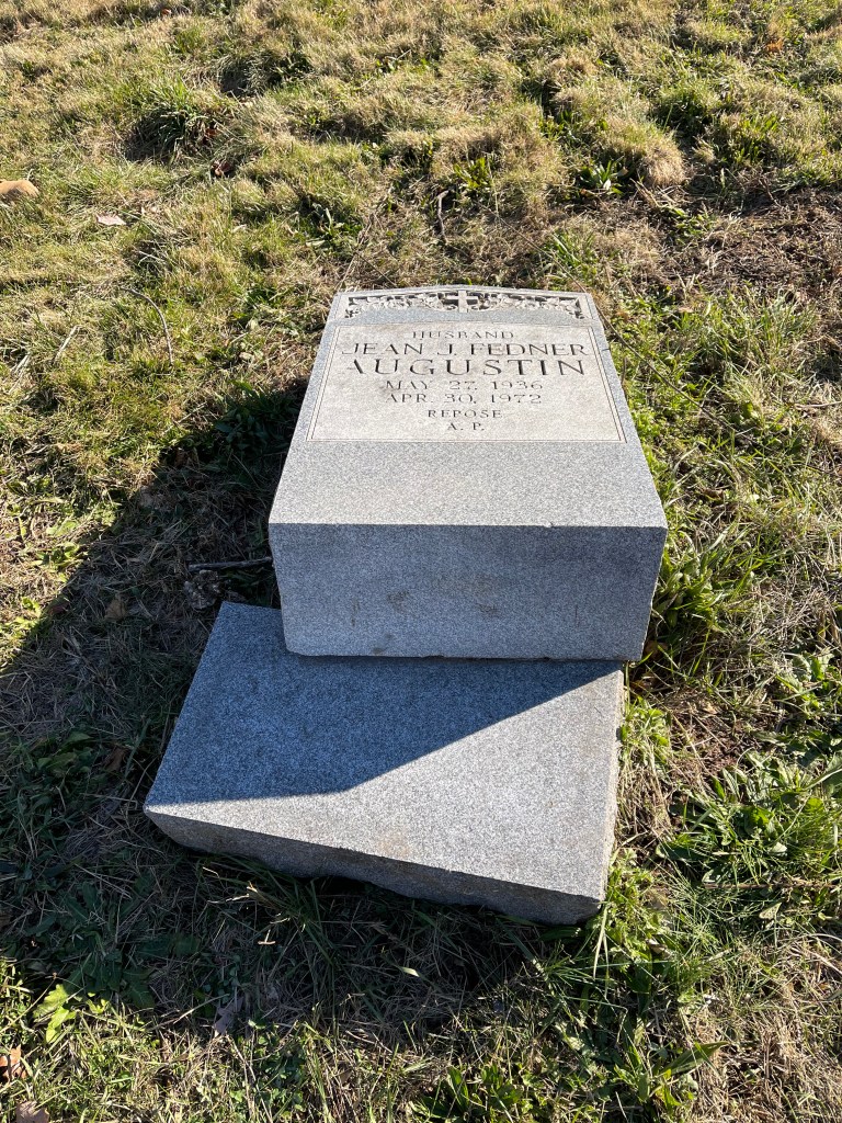 Reaching across from Section HI the monument crew was able to easily reset this headstone in adjacent Section S10. This work is funded by donations.
