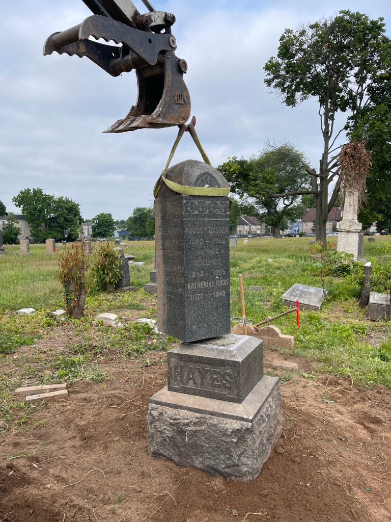 This monument in Section S Lot 70 was found overgrown and had fallen down. First the brush was cut away and then the stumps of weed trees removed. Next the base was removed, and the existing foundation of stones was levelled, stabilized and reinforced with additional bricks and stones. Each piece was then reset and checked to be level and plumb. This equipment usage and materials costs are funded by donations. Thank you.