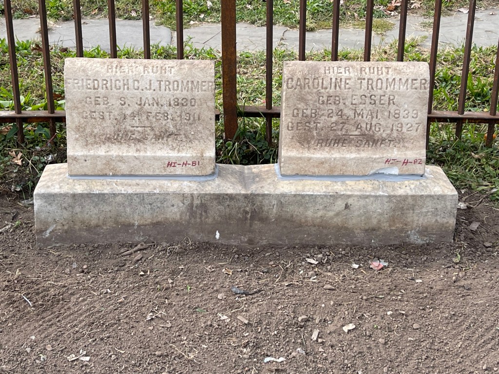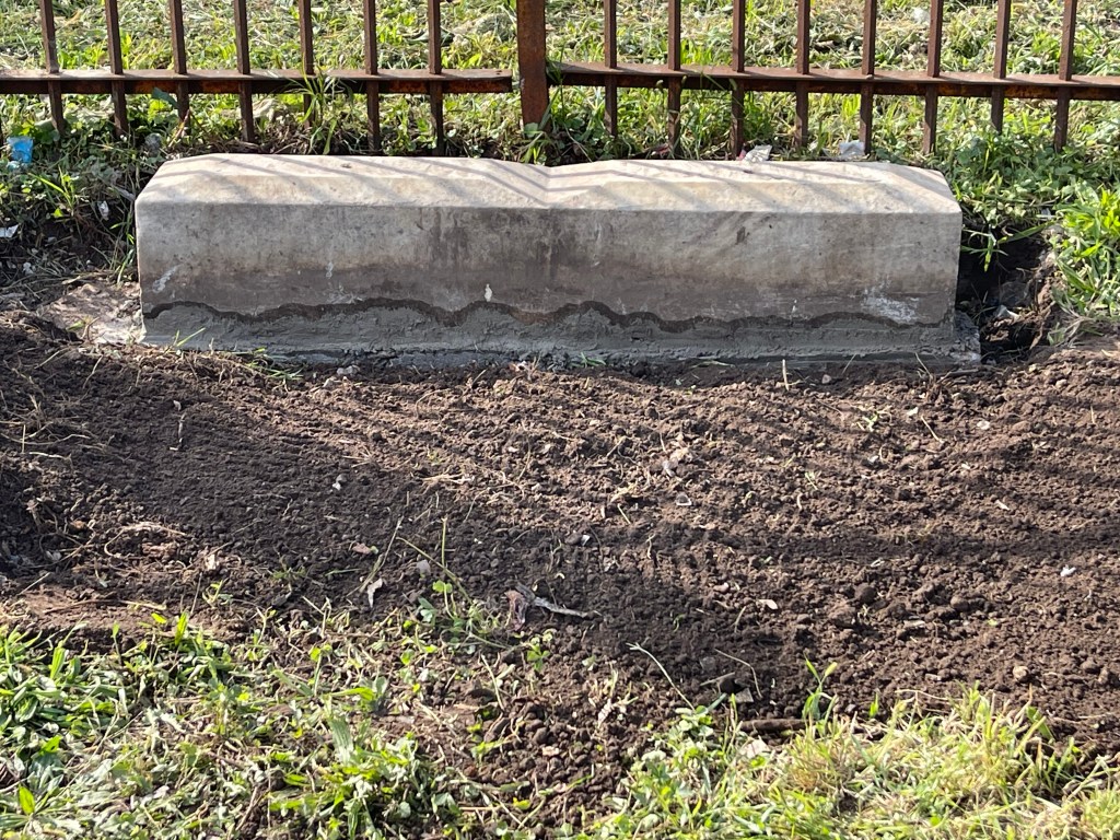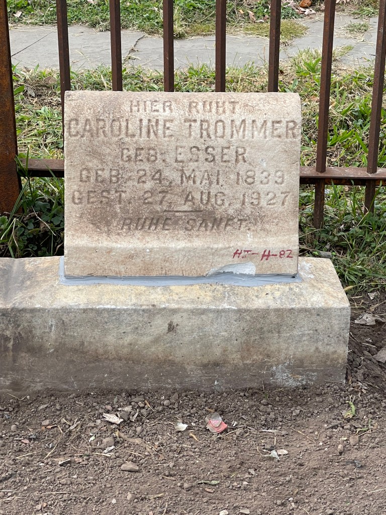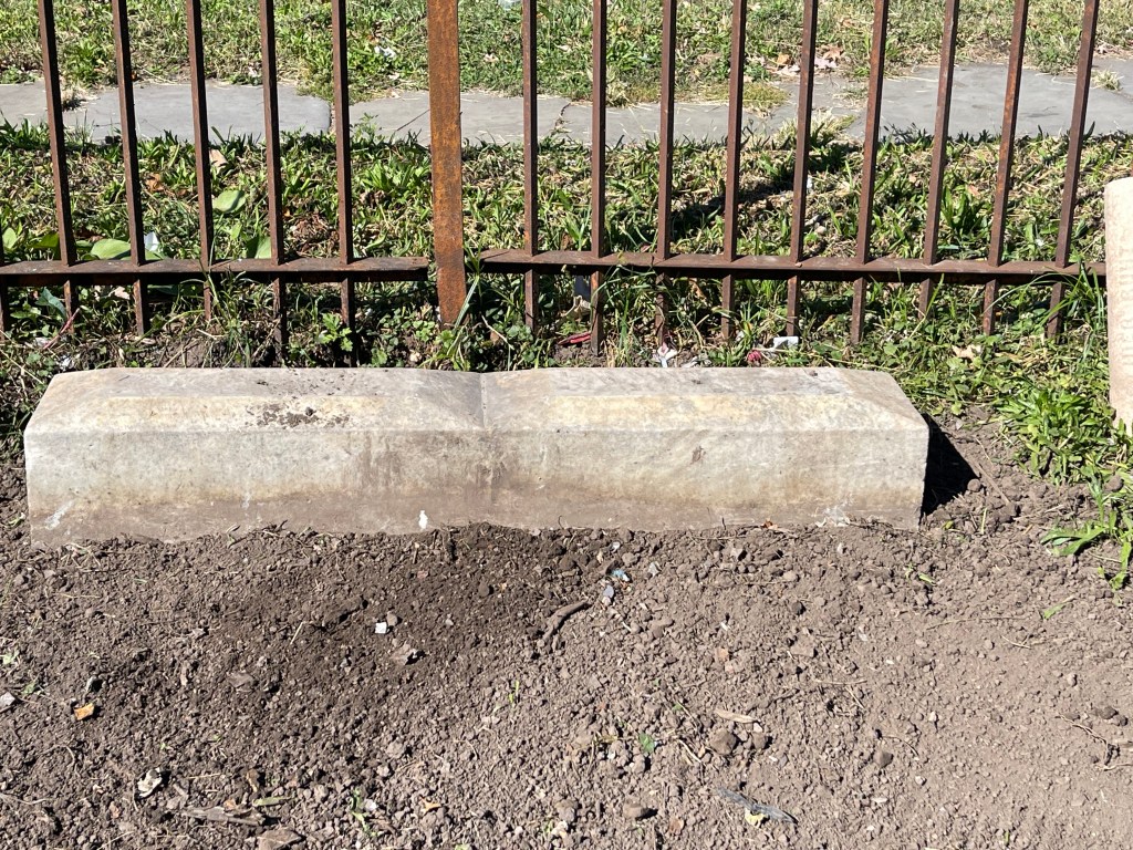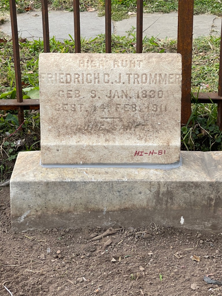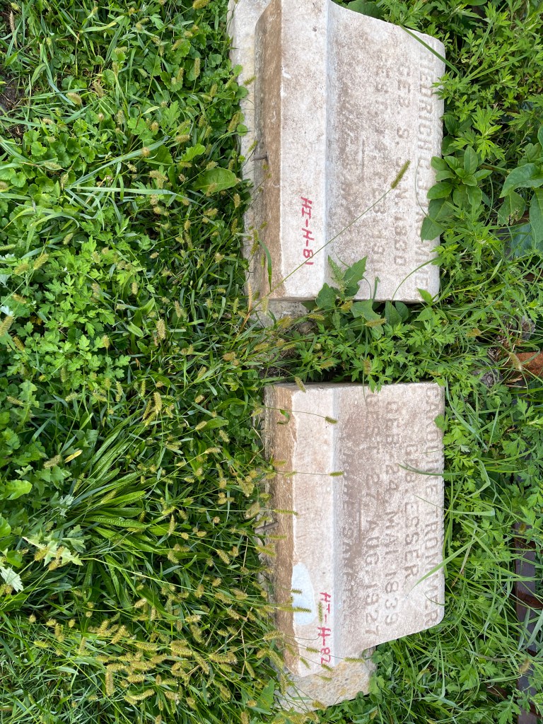 While working in Section HI Row H the headstones for Fritz & Caroline were found lying on the ground separated from their base which was also moved off its foundation. The foundation was excavated and leveled with a concrete cap below grade, the base reset with mortar and then the individual headstones set in place using adhesive. This location is Section HI Row H Graves 81 and 82. The materials for this work were paid for with $100. in donations. Thank you