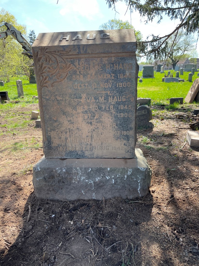 This very heavy Haug family monument located in Section R Plot 88 was found lying face down and for what was most likely a very long time. The excavator could not hold the weight of the stone, so wood cribbing was used support the stone as it was inched up. The lifting strap also had to be moved from the bucket to the middle of the excavator arm which increased the lifting capacity for this stone. The area around the stone base was cleaned up and graded. Now mother nature will wash the stone and the mud off the face. Another big, beautiful monument up righted and funded by a Prudential Community Beautification Grant. Thank You.