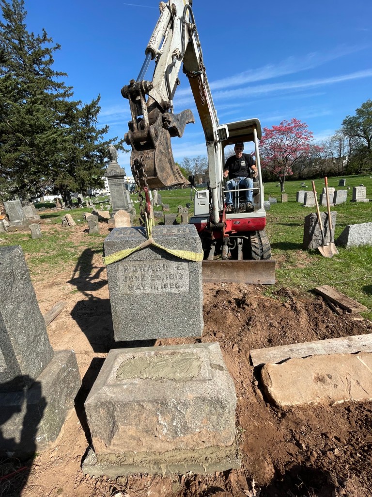 This heavy stone for Howard E. Kramer in Section R Plot 162 Grave 2R was found on the ground with its base also off the foundation. After the base and stone were moved to the side out of the way, the foundation was uncovered and leveled with concrete. After the concrete hardened the base was reinstalled and the stone set on top. This area was found crowded with toppled stones but is now starting to shape up with this reset. Another heavy monument up righted and restored with funding from a Prudential Community Beautification Grant. Thank You.