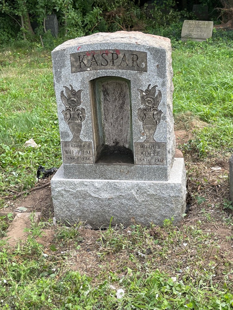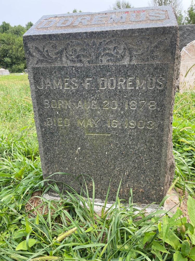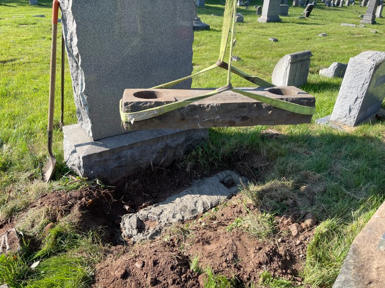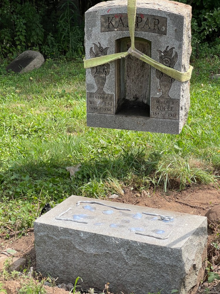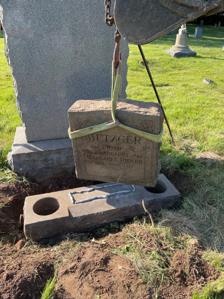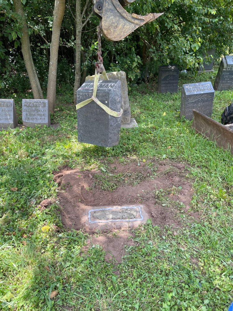 A very busy day and part of resetting 12 heavy monuments at various locations throughout the maintained area of the cemetery. Ten of these heavy monuments were up righted and restored on their foundations. Two up righted were direct burials with no foundation. Funding for this restoration work was provided from a Prudential Community Beautification Grant. Thank You.